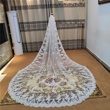 2022 패션 얇은 명주 그물 아플리케 럭셔리 레이스 긴 웨딩 베일 신부 베일 레이스 성당 웨딩 베일