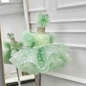 Rosa verde Tulle ragazza fiore vestito per matrimonio di lusso Applique Puffy lungo pavimento principessa bambino prima comunione abito da ballo