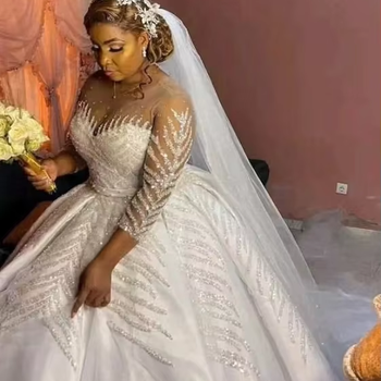 Nova Chegada Luxo Princesa Vestido De Noiva Manga Longa Frisada Pérola Vestido De Baile Big Train Vestido De Noiva